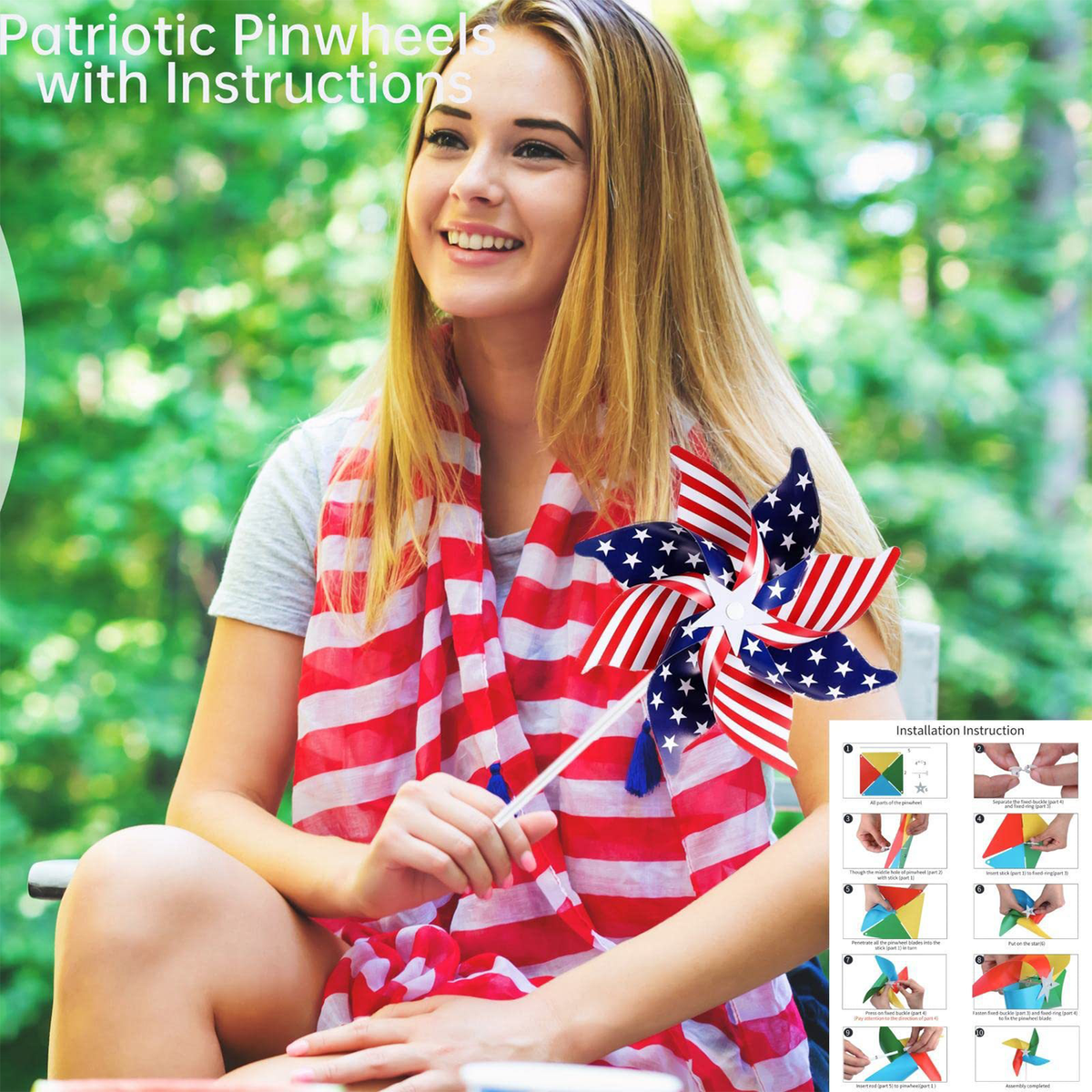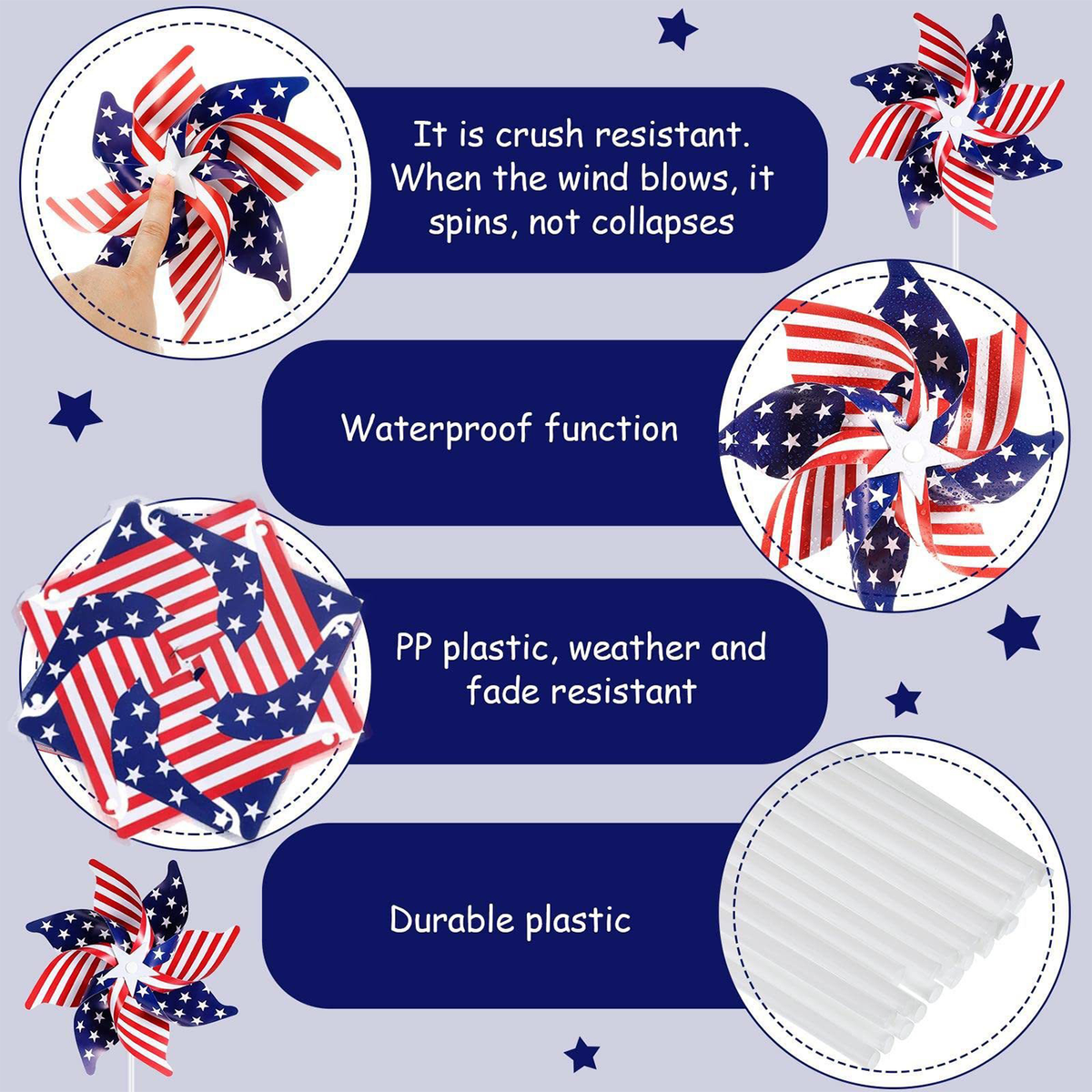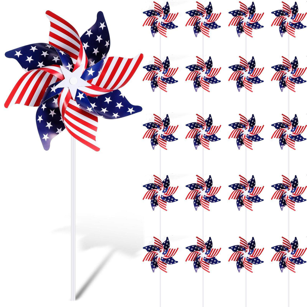 The size of the wind spinners is 8.3", 7.5", 5.9". Suitable for garden decorations for outside, patriotic decorations outdoor, red white blue decorations, patriotic decorations outdoor, wind spinners outdoor,bird repellent outdoor. The US flag pinwheels features with red and white stripes, blue and white stars, vivid color and durable material, great choice for red white blue decorations, patriotic outdoor decorations, american outdoor decorations, patriotic pinwheels.